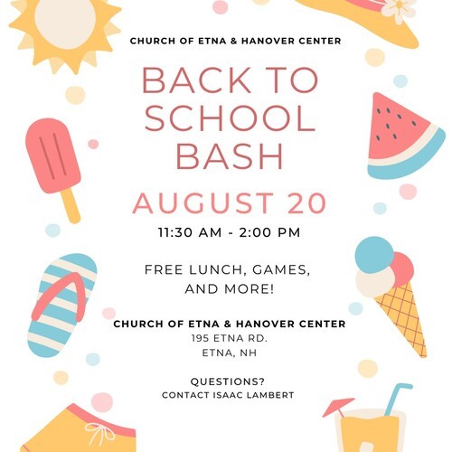 - Sunday August 20 @11:30 am - Back to School Bash @ Etna church (kids and teens 5 - 18 years old) SEE BELOW for more information!