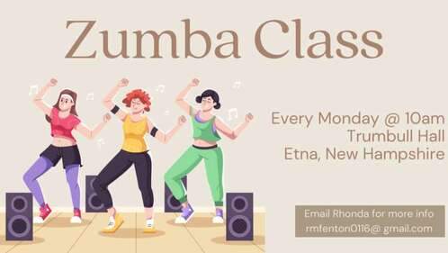 Zumba kickoff (dance-off?) for 2024: Rhonda Fenton will be offering a free Zumba class, open to all, on Monday January 1, 2024. Bring your family and friends and come to dance and have fun for an hour! Trumbull Hall at the Etna church, as usual, 10 am. Don't miss this unique opportunity to give Zumba a try!