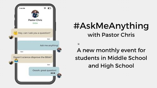 Ask Anything with Pastor Chris: Being a person of faith doesn’t mean you don’t have questions. And let’s face it, middle- and high-school students are filled with big questions. All middle school and high school students are invited to come hang out at the church with Pastor Chris on Wednesday, May 29, at 6 pm and bring your questions with you. He doesn’t claim to have all the answers, but he’ll share from his knowledge of the Bible and his own experience. You can send your questions ahead of time via email or text them to Pastor Chris.